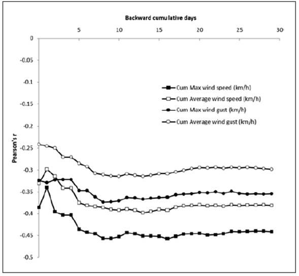 Conversely, there was a negative correlation between the variables Maximum wind speed, Average wind speed, Maximum wind gust and Average wind gust and the presence of M. velezangeli, reaching an absolute maximum in correspondence with the cumulative data of the 13 days previous to the assessment (Pearson's r Max WS = - 0.45; Pearson's r AWS = -0.40; Pearson's r Max WG = - 0.37; and Pearson's r AWG = - 0.31); all of which indicates that high gust and wind speeds diminished the incidence of the insect (Figures 2 and 3).
