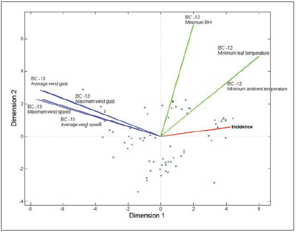 The described scenario is summarized by a Biplot representation including the incidence of M. velezangeli and the backward cumulative climatic variables that showed the greatest absolute correlations with incidence (Figure 3).