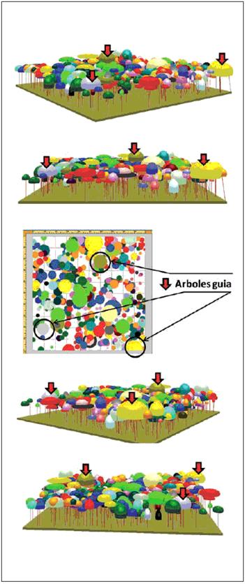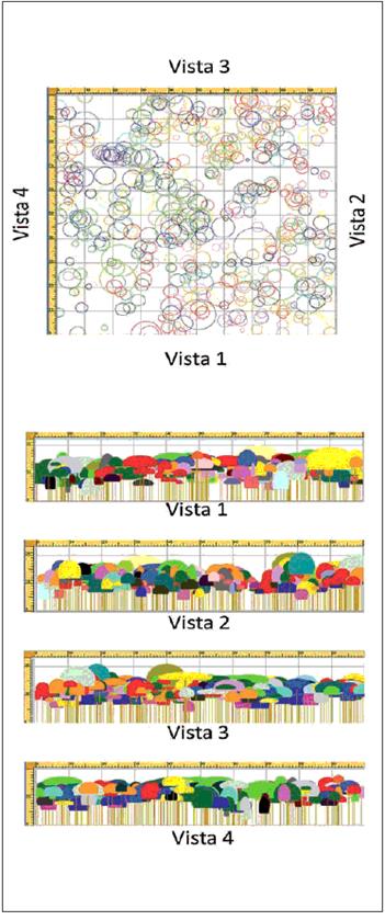 Los diagramas de perfil (figura 9) correspondientes a las vistas 1 a 4, reflejan la presencia de un continuo de vegetación en altura y, además, permite observar la presencia de los estratos mencionados (Es, Em y Ei) y, con ayuda de la vista de planta y en tercera dimensión (3D) (figuras 9, 10 y 11), se puede analizar la distribución de la vegetación tanto en el plano vertical como en el plano horizontal y en una vista en 3D.