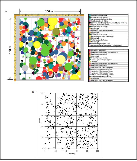 Teniendo en cuenta los resultados de la identificación taxonómica de especies, se encontró que, en la parcela de bosque, se tienen 519 individuos. En la figura 11 (A y B), se presenta la distribución espacial de los individuos con DAP>10 cm, donde se evidencia un comportamiento que no obedece a un patrón espacial definido, propio de bosques naturales heterogéneos disetáneos.