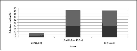 Para el análisis de la estructura vertical se definieron tres estratos arbóreos: superior (Es), medio (Em) e inferior (Ei), dependiendo de las alturas máxima y mínima de los individuos con DAP>10 cm.
