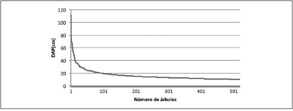 De acuerdo con la tabla 4, el área basal de los 519 árboles con DAP>10 cm es de 14,64 m2, y, según el número de individuos presentes por clase diamétrica, presenta la distribución en J invertida (figura 13), es decir que hay un menor número de individuos con DAP>20 cm. Esta distribución representa la tendencia del bosque en buscar la fase de homeostasis (equilibrio entre lo que se muere y lo que crece); aspectos representados por los movimientos que se presentan en el paso de individuos entre las clases diamétricas, lo cual es parte de la dinámica natural del bosque, en donde la cantidad de individuos que logran establecerse durante los primeros años va disminuyendo conforme aumenta la clase diamétrica producto de la competencia intra e interespecífica y de las exigencias lumínicas que requieren algunas de las especies para obtener un sitio dentro el bosque (Rodríguez y Brenes 2009).