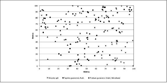En la figura 14 se muestra la distribución espacial de las tres primeras especies más representativas de acuerdo con el IVI, presentes en la parcela permanente de una hectárea. Al ser las especies tuno (Miconia sp1) y quincedías (Tapirira guianensis Aubl.), dos de las con mayor índice de valor de importancia (IVI) 29,52 y 23,87, respectivamente, nos indica que esta parcela es representativa de un bosque secundario.