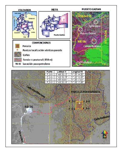 En un área dentro de los predios de Meta Petroleum Limited-Campo Rubiales, a 160 km del casco urbano de Puerto Gaitán, se llevó a cabo el establecimiento de una parcela permanente de bosque de una hectárea. A la parcela se accede por un sendero peatonal desde la locación del pozo RB-36, en un bosque que se halla ubicado en inmediaciones de los caños Masififeriana y Rubiales en el municipio de Puerto Gaitán (Meta, Colombia).