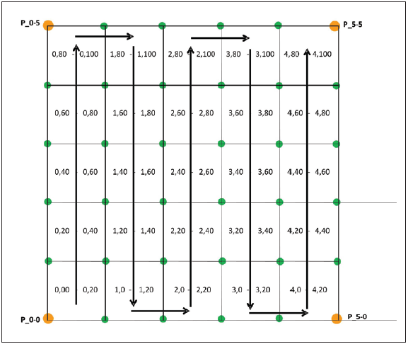 La parcela de un hectárea (figura 3) fue demarcada de forma cuadrada (100x100 m), dividida esta, a su vez, en subcuadrantres de (20x20 m). La demarcación se realizó con tubos de PVC de 3" color naranja, para los vértices de la parcela (P_0-0; P_0-5; P_5-5 y P_5-0) y con tubos de PVC de 2" color verde, para los subcuadrantes, los cuales fueron previamente marcados con pintura de aceite, indicando la ubicación de cada uno de ellos, según coordenadas x, y (figura 3).