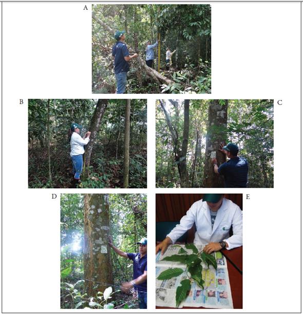 Esta actividad se realizó en el periodo comprendido entre enero y febrero de 2011, la toma de los individuos con DAP mayores a 10 cm o 31,5 cm de circunferencia, además de otra serie de datos como: localización X y Y; altura total árbol; altura y diámetro de copa; y porcentaje de luminosidad; se marcaron todos los árboles con esta característica (DAP>10 cm), con placas de aluminio, la cual contiene el número de censo y el número del árbol inventariado; está dispuesta en la parte superior de la marca que se realiza con pintura de aceite a los 1,30 m; se colectaron en campo 60 muestras para su identificación taxonómica, las cuales reposan en el herbario de la Universidad de los Llanos (Unillanos) (figura 5), con el fin de identificar los árboles que hacen parte del inventario y evitar errores en el momento de un inventario futuro.