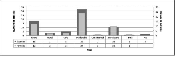 De las 72 especies reportadas en la parcela de acuerdo con los usos principales, se tiene que: 32 son maderables y pertenecen a 24 familias, 18 son para alimentación de la fauna, pertenecen a 12 familias, 10 son de carácter protector de microcuencas, pertenecen a 10 familias, 5 son proveedoras de leña, pertenecen a 3 familias, 3 son frutales, pertenecen a 2 familias, 1 productora de tinte y 1 de carácter ornamental.