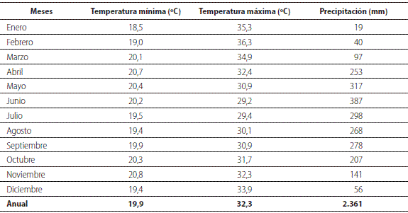 Para la zona de ubicación de la parcela en Campo Rubiales, se estima una precipitación máxima anual de 2.361 mm (tabla 1), el régimen de lluvias es monomodal, con un período entre los meses de abril a octubre y el seco de diciembre a marzo. El mes de mayor precipitación es junio y el de menor enero. La temperatura promedio multianual máxima es de 32,3 °C y la mínima de 19,9 °C.