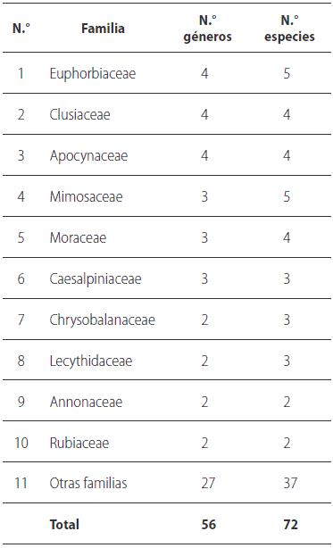 Se registraron 519 individuos pertenecientes a 72 especies, 56 géneros y 36 familias de plantas leñosas. En la tabla 2, se presentan las familias con mayor número de géneros y especies. Se destacan las familias Euphorbiaceae (4 géneros y 5 especies), Clusiaceae y Apocynaceae (4 géneros y 4 especies), Mimosaceae (3 géneros y 5 especies).