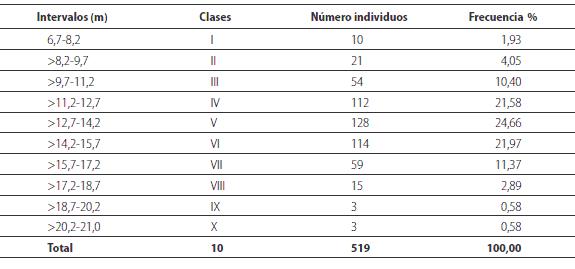 Para la evaluación de la estructura vertical se tomaron los individuos con alturas mayores a 6,7 m, correspondiente a la altura mínima que se presentó el estrato arbóreo, con DAP>10 cm. Como se puede apreciar en la tabla 3, los individuos presentan una mayor concentración en las clases medias. Se tiene entonces a las clases IV, V y VI (11,2-12,7 m, 12,7-14,2 m y 14,2-15,7 m) con los valores más altos de frecuencias 21,58 %, 24,66 % y 21,97, respectivamente, que evidencia un mayor desarrollo de la vegetación y las clases I, IX y X con frecuencias menores a 2 %. La mayor altura registrada para la parcela fue de 21 m, reportados por individuos de las especies chaparro de agua (Panopsis rubescens) y merecurillo blanco (Licania kunthiana Hook. f.).