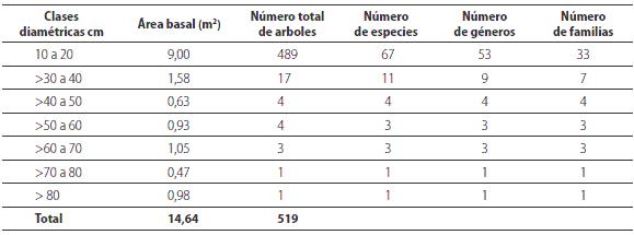 El área basal de los 519 árboles con DAP>10 cm es de 14,64 m2 y, según el número de individuos por clase diamétrica, presenta la distribución en J invertida, es decir que hay un menor número de individuos con DAP>20 cm, lo cual representa un alto grado de regeneración natural que es debido a la alta intervención que presenta el predio donde se localiza la parcela de monitoreo.