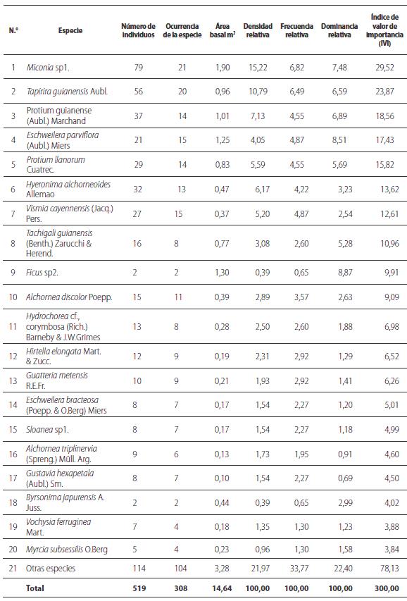 De la tabla 5 se observan las especies que presentan un mayor índice de valor de importancia (IVI) y, son en su orden, son: tuno (Miconia sp1.), quincedias (Tapirira guianensis Aubl.), carguero [Eschweilera parviflora (Aubl.) Miers], caraño macho (Protium llanorum Cuatrec.), chaparro de monte (Hyeronima alchorneoides Allemao), manchador [Vismia cayennensis ( Jacq.) Pers.], parature (Tachigali guianensis (Benth.) Zarucchi & Herend.), matapalo (Ficus sp2.) y rebentillo morado (Alchornea discolor Poepp.).