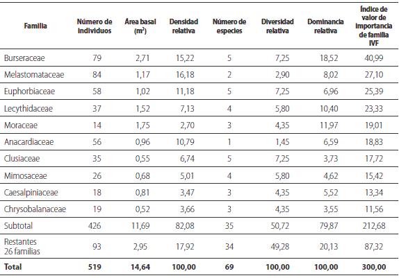 Para evaluar la importancia ecológica de las especies y las familias en la parcela se calcularon, respectivamente, los índices de valor de importancia (IVI), de acuerdo con Curtis et al. (1959), y el de valor de importancia para familias (IVF), según lo propuesto por Mori y Boom (1983), que se obtienen como la sumatoria de la densidad, la dominancia y la riqueza relativas de cada especie y familia.