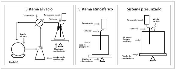El esquema de los sistemas de laboratorio diseñados y montados bajo los criterios de la norma ISO 5725, para simular la evaporación del jugo de caña a diferentes presiones, se muestra en la figura 1.