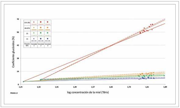 Para todos los sistemas de presión estudiados, la variedad 1 presentó los menores valores de coeficiente glucósido y la variedad 3 presentó los mayores valores; adicional-mente, no se observó una correlación entre los coeficientes glucósidos del jugo y el coeficiente glucósido de la miel.