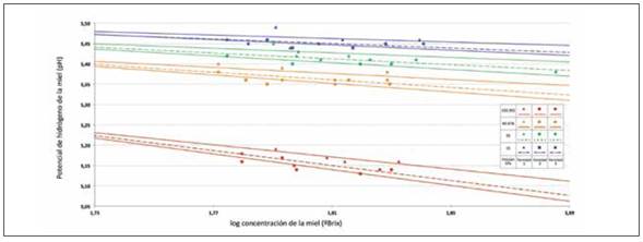 Así mismo, los valores de pH de los tratamientos presurizado y atmosférico presentan diferencias de 0,2 a 0,3, que son cuatro veces las existentes entre los valores del pH de las mieles del sistema atmosférico y las de vacío de 35 kPa, y ocho veces las diferencias, entre los valores de las mieles de los sistemas al vacío de 35 y 15 kPa. Esta significativa reducción del pH de las mieles producidas en sistemas presurizados, al aumentar la presión, posiblemente tiene su explicación en el efecto piezoeléctrico, ya que la presión cambia las dimensiones moleculares, el momento dipolar total y, por tanto, la tensión eléctrica de salida, la cual produce un aumento de la acidez (Clotet y Díaz 1995).