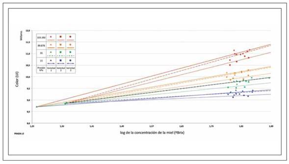 La figura 4 también permite apreciar que el color de la miel establece con cada una de las presiones un subconjunto homogéneo y, en cada uno de ellos, las variedades forman dos subconjuntos. Comportamiento que comprueba los resultados del análisis estadístico, cuyo resumen se reporta en la tabla 8.