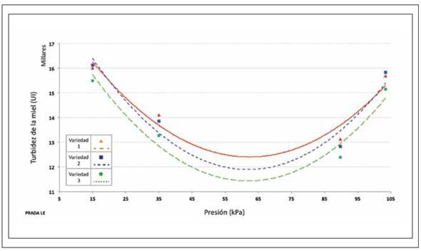 El análisis estadístico y gráfico de los datos de la turbidez, presión y concentración de la miel, muestra que la turbidez de las mieles de todas las variedades y presiones estudiadas es directamente proporcional al logaritmo de la concentración de la miel.