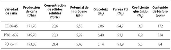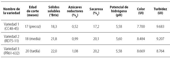 En la tabla 2, además de la edad de corte de cada variedad, se muestra la caracterización fisicoquímica del jugo de cada una de las variedades estudiadas.