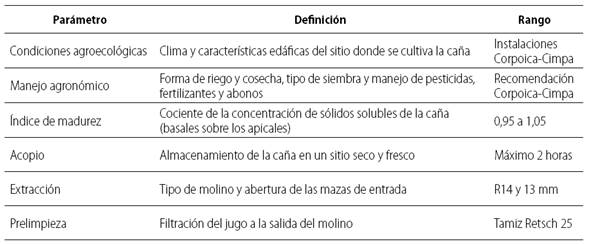Para controlar los efectos de ruido que pudieran ser ocasionados por la selección de la caña y la preparación de la muestra, se fijaron las variables que se presentan en la tabla 4.