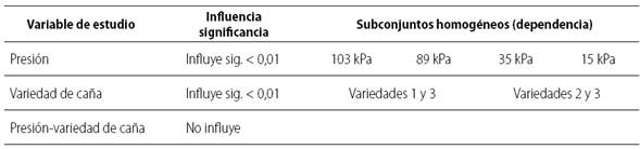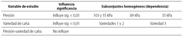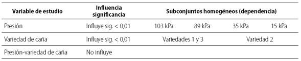 Las tres variedades en todos los sistemas de presión estudiados presentaron un comportamiento similar, con diferencias estadísticamente no significativas en los valores de las variables: sacarosa, azúcares reductores, coeficiente glucósido, pH y color, pero sí tienen efecto sobre la turbidez, con diferencias de significancia menor de 0,01. De esta forma, las diferencias de color que el consumidor percibe entre las panelas provenientes de las diferentes variedades de caña, son acentuadas por la turbidez.