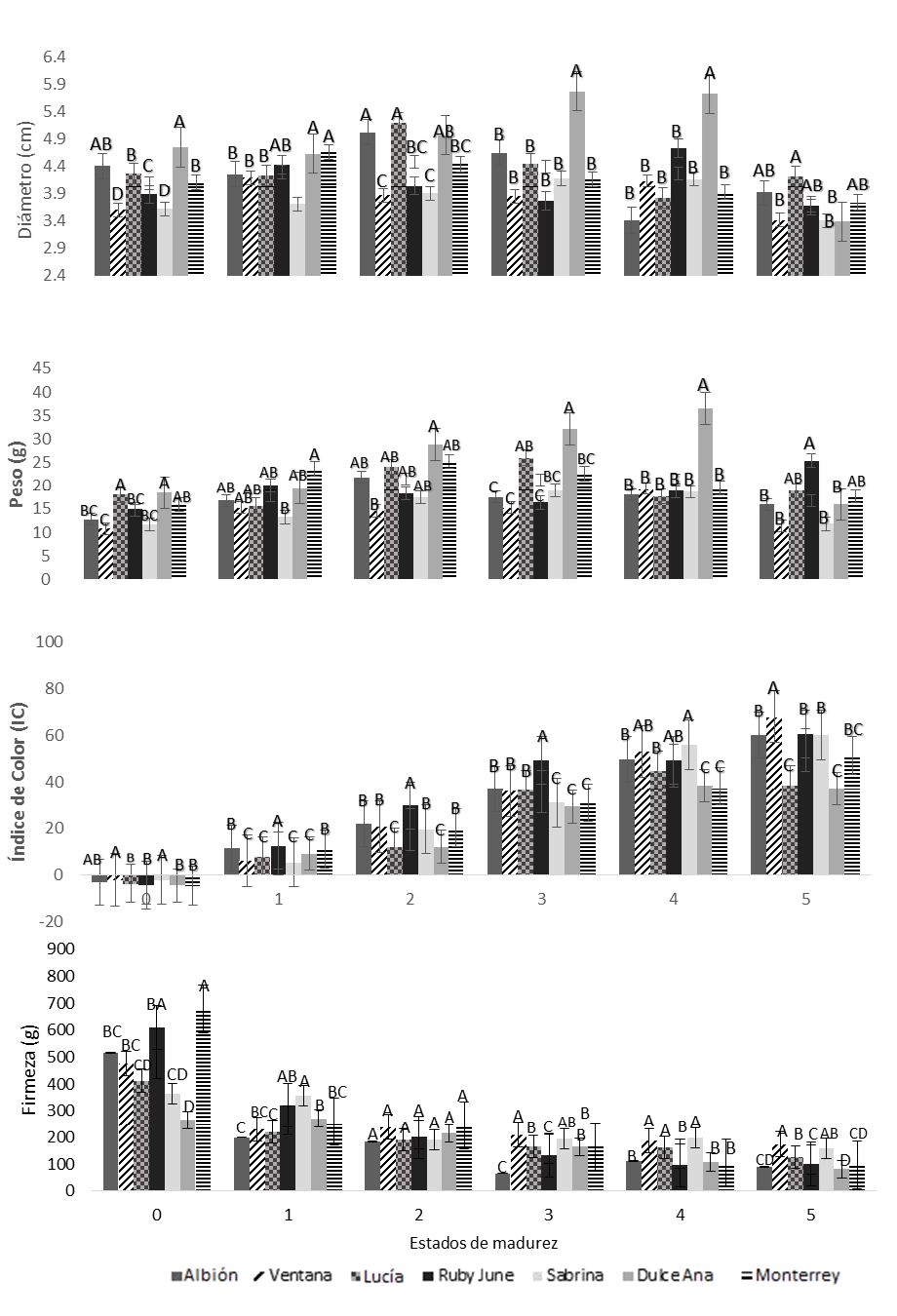 Las mayores diferencias en las variedades se expresan en los estados tempranos de madurez, manteniéndose la tendencia de Monterrey como la más firme y Dulce Ana como la de menor firmeza; sin embargo, Ventana presentó los mayores valores durante los últimos tres estados de madurez: 210,6 g, 187,8 g y 173,6 g, respectivamente.