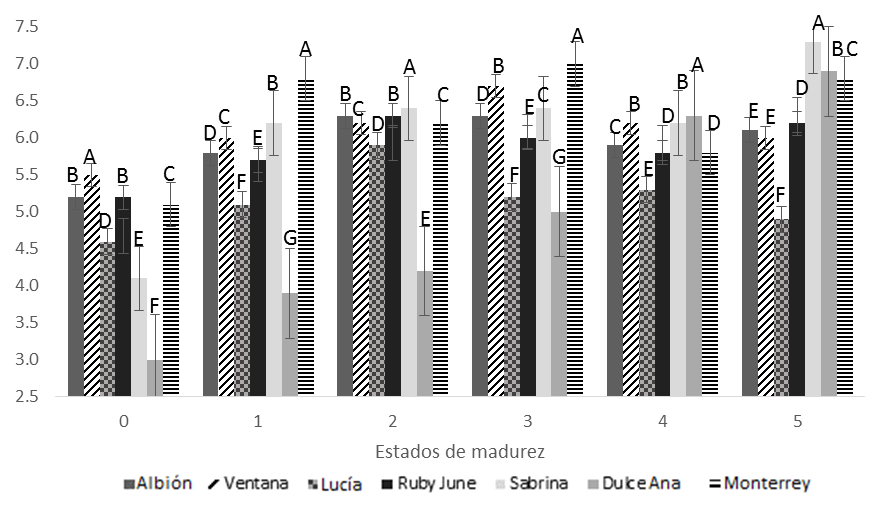 Shaw y Larson (2009) reportan valores de firmeza iguales en Albión y Monterrey, lo que concuerda con lo observado en los estados del 1 al 5, en los que estas dos variedades no mostraron diferencias significativas. Por otro lado, cuando se compararon Sabrina y Ventana con la variedad Camarosa, diferentes estudios de Pierron (2012) y de Larson y Shaw (2003) mostraron una firmeza superior en Ventana, lo que concuerda con los resultados de este estudio.
