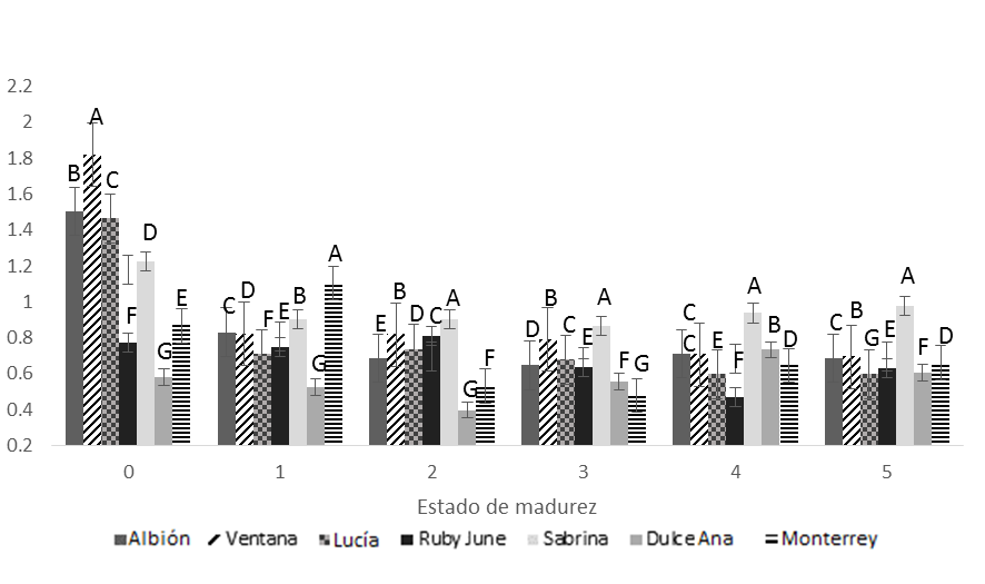 Los SST de las variedades mostraron diferencias significativas (p = 0,002) (figura 2), y los mayores valores correspondieron a Monterrey, Sabrina, Ventana y Albión. Sabrina logró la mayor acumulación de SST en la madurez completa del fruto (5), y Dulce Ana presentó la menor concentración, debido a su bajo contenido inicial de SST (en los estados de madurez 0, 1, 2 y 3); sin embargo, fue la variedad que presentó la mayor tasa de acumulación durante todo el desarrollo del fruto.