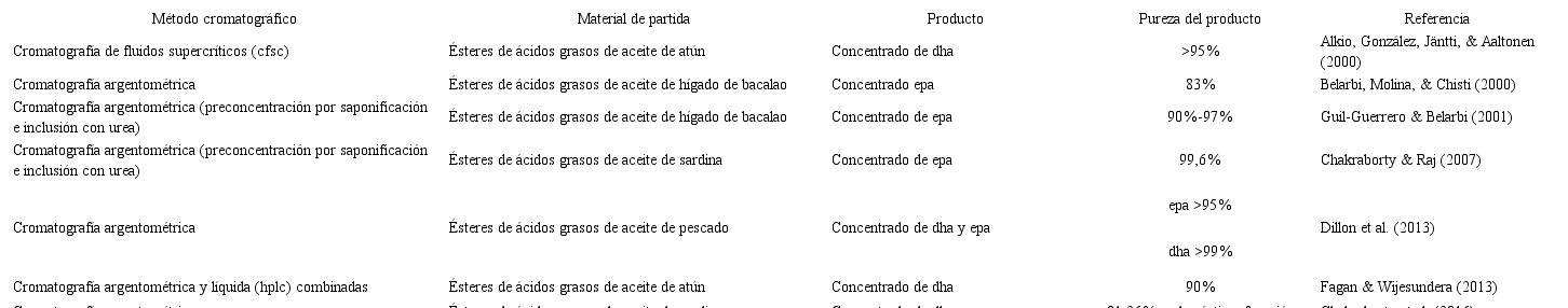 Los métodos cromatográficos son usados para la concentración de agpi, en particular de epa y dha, e incluyen cromatografía líquida (hplc), argentométrica y de fluidos supercríticos, para la obtención de productos de alta pureza (>95 %) (Dillon, Aponte, Tarozo, & Huang, 2013). Por lo general, las separaciones aplican cromatografía argentométrica y se conducen sobre etilésteres de ácidos grasos, en algunos casos combinando etapas de preconcentración previas al fraccionamiento final por cromatografía (tabla 8).