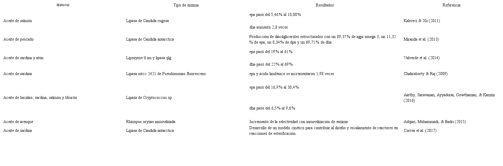 Algunos estudios proponen la aplicación de estos procesos antes de otras etapas, como destilación molecular o filtración por membranas, con el fin de obtener concentrados de ácidos grasos omega 3. La tabla 9 presenta los materiales estudiados y el tipo de enzima utilizado para concentrar aceite de pescado.
