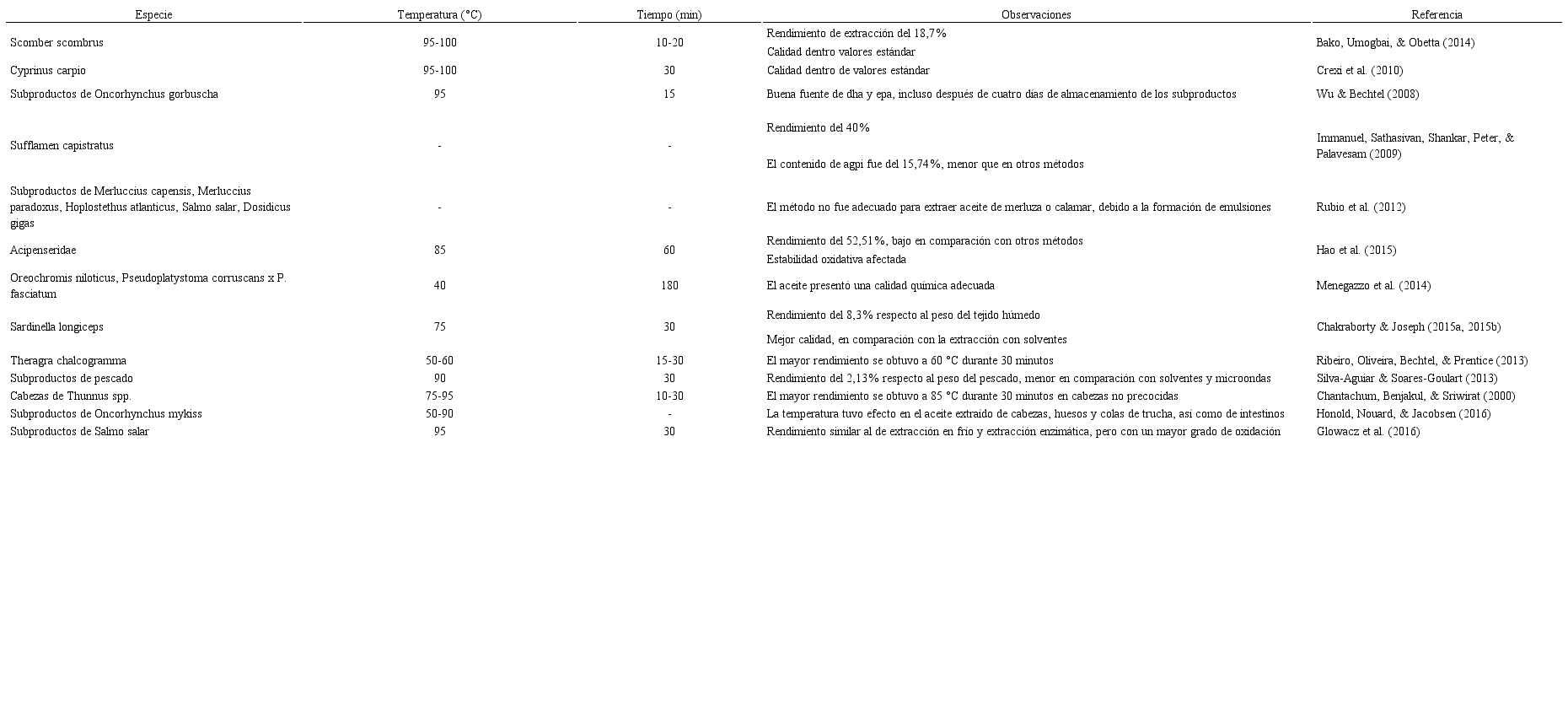 Se han aplicado para la extracción de aceite de pescado como única tecnología (Adeniyi & Bawa, 2006; Boran, Karaçam, & Boran, 2006; Kołakowska, Domiszewski, Kozłowski, & Gajowniczek, 2006; Shamsudin & Salimon, 2006), así como en estudios comparativos con otros métodos (Chakraborty & Joseph, 2015a; Fiori et al., 2012; Immanuel et al., 2009; Létisse, Rozières, Hiol, Sergent, & Comeau, 2006; Rincón-Cervera et al., 2017; Sahena et al., 2010; Silva-Aguiar & Soares-Goulart, 2013) (tabla 2).