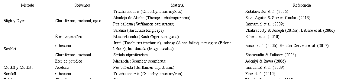 Existen varios métodos que varían de acuerdo con el tipo de solvente o tratamiento de la muestra. Los más comunes son los de Soxhlet y Bligh-Dyer, pero también se han evaluado otros, como el de McGill-Moffatt, así como los de Randall y de Folch (Fiori et al., 2012; Immanuel et al., 2009; Rincón-Cervera, Villarreal-Rubio, Valenzuela, & Valenzuela, 2017).