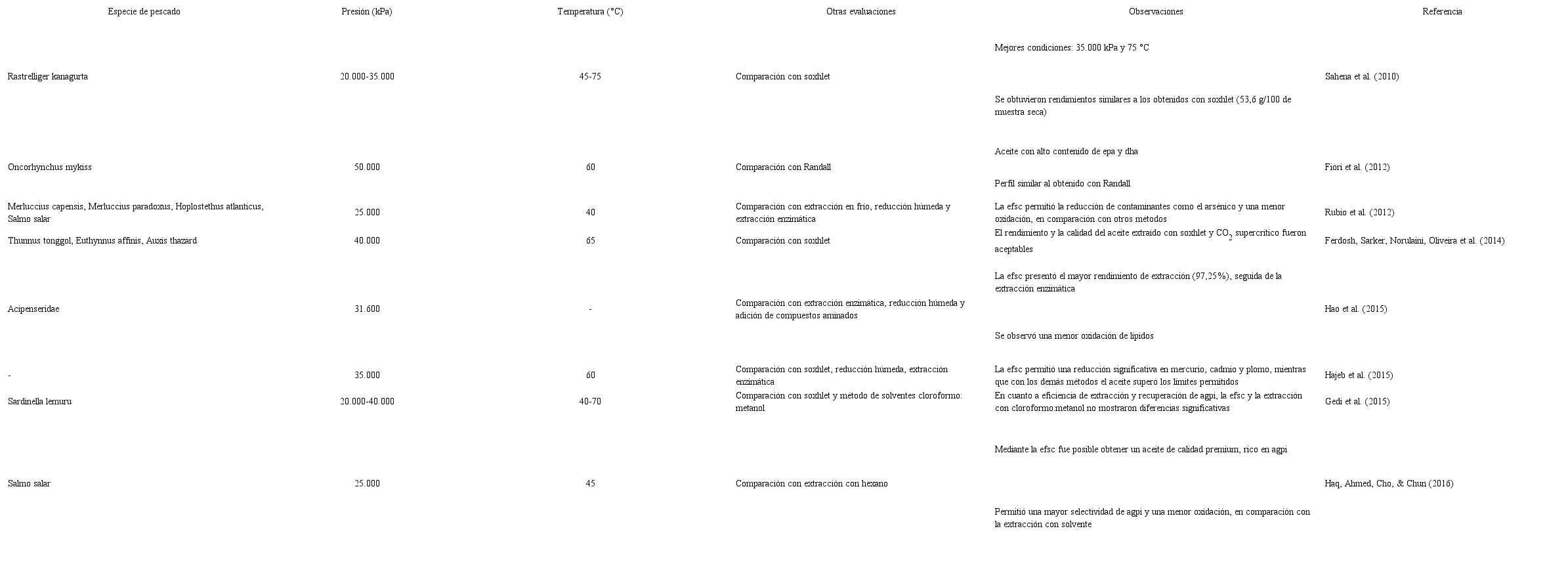 Otros estudios, que comparan la efsc de aceite de pescado con otras técnicas de extracción (tabla 3) (Ferdosh, Sarker, Norulaini, Oliveira et al., 2014; Fiori et al., 2012; Hao et al., 2015; Rubio et al., 2012; Sahena et al., 2010), muestran que esta tecnología es atractiva en procesos convencionales, para obtener aceites ricos en agpi y con un contenido reducido de contaminantes.