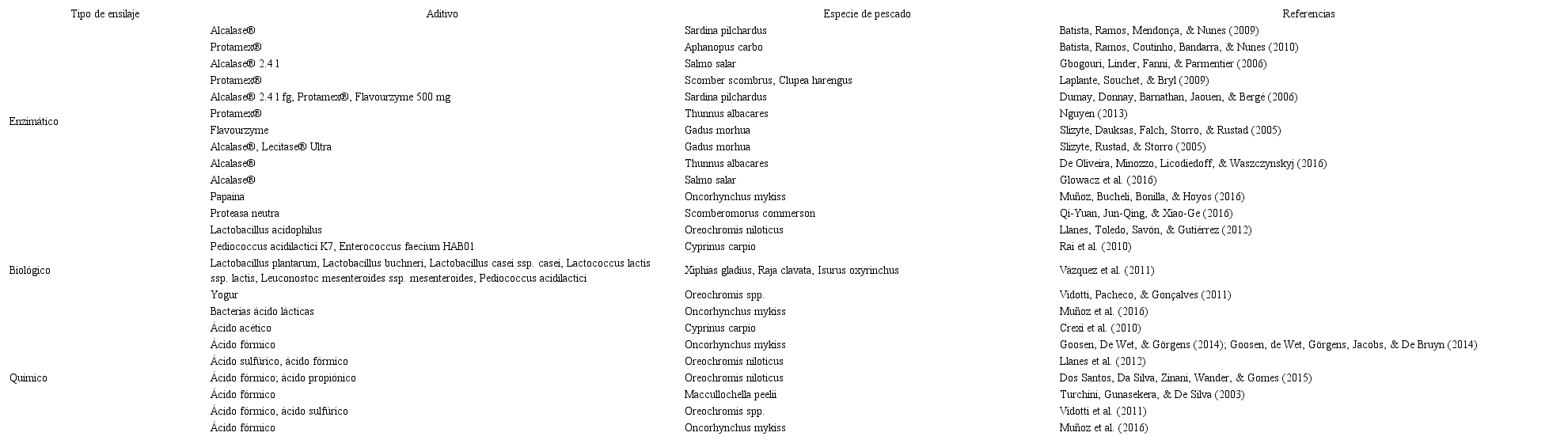 Algunos estudios se han orientado a la evaluación de este procedimiento para la extracción de aceite de pescado entero o de sus subproductos (tabla 4). Una de las técnicas más estudiadas es el ensilaje enzimático con diferentes tipos de proteasas, pero los ensilajes biológico y químico también son usados en diversas investigaciones para la separación de aceite de pescado.