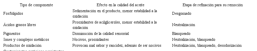 El aceite crudo contiene impurezas, que dependen del método de extracción utilizado (Chakraborty & Joseph, 2015a), y requiere un proceso de purificación para alcanzar las características de calidad que lo hagan aceptable para su consumo (Crexi, Legemann-Monte, Almeida de Souza, & De Almeida-Pinto, 2010).