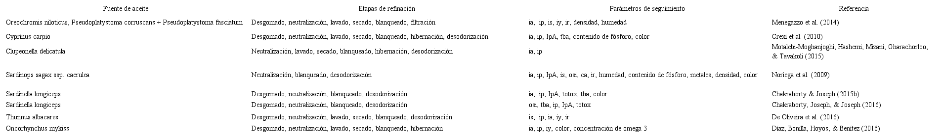 Una vez extraídos, los aceites de pescado requieren un proceso de purificación para alcanzar las características de calidad que lo hagan aceptable para su consumo (Crexi et al., 2010), dado que contienen impurezas insolubles, fosfolípidos, ácidos grasos libres, humedad, productos de oxidación primaria, minerales, pigmentos e incluso contaminantes orgánicos persistentes (pop, por sus siglas en inglés).