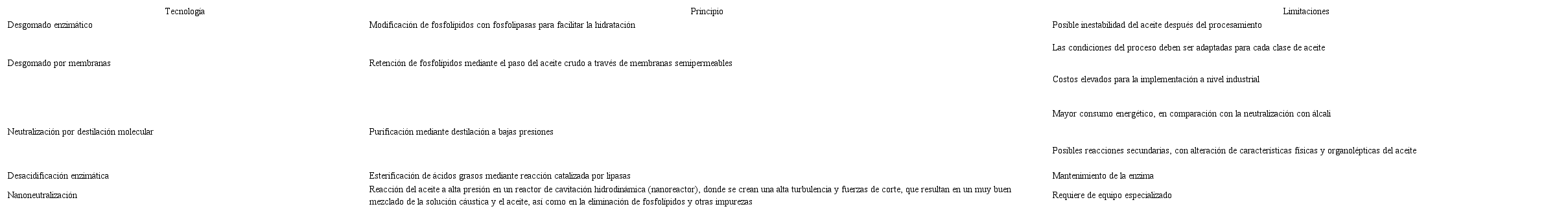Algunos autores han realizado una revisión de diferentes tecnologías descubiertas y redescubiertas (como el caso de procesos enzimáticos) para la optimización del proceso de refinación de aceites comestibles (tabla 7) (Čmolik, & Pokorný, 2000; Kumar & Krishna, 2015; Misra, Nandi, & Nandi, 2013; Moharana, Byreddy, Puri, Barrow, & Rao, 2016; Vaisali et al., 2015).