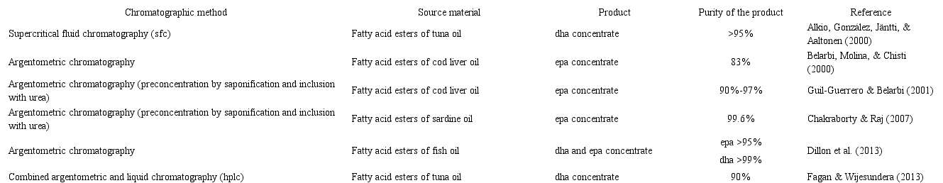 The chromatographic methods are used for the concentration of pufa, in particular of epa and dha, and include liquid chromatography (hplc), and argentometric and supercritical fluids, to obtain products of high purity (> 95 %) (Dillon, Aponte, Tarozo, & Huang, 2013). In general, the separations are carried out through argentometric chromatography and are conducted on ethyl esters of fatty acids, in some cases combining preconcentration steps prior to the final fractionation by chromatography (table 8).