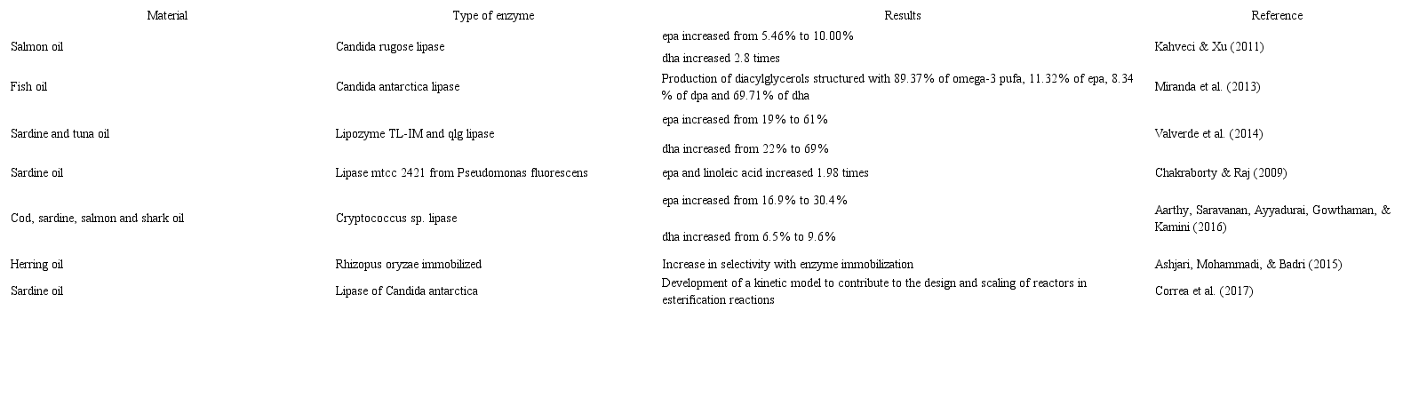 Some studies propose the application of these processes before other stages, such as molecular distillation or filtration by membranes, to obtain concentrates of omega-3 fatty acids. Table 9 shows the materials studied and the type of enzymes used to concentrate fish oil.