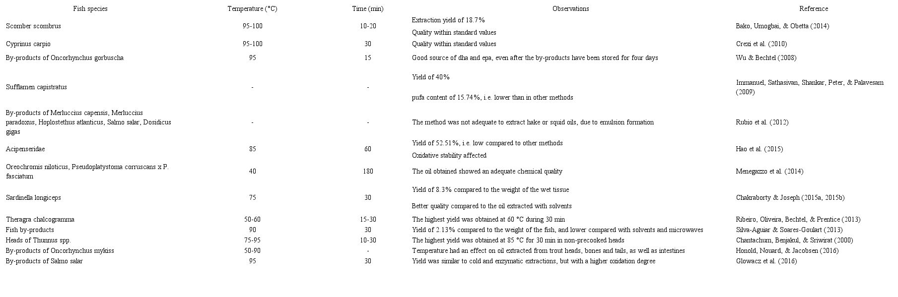 Some studies have focused on the evaluation of this procedure for the extraction of oil from whole fish or its by-products (table 4). One of the most studied techniques is enzymatic silage with different types of proteases, but biological and chemical silages are also used in various investigations for the separation of fish oil.