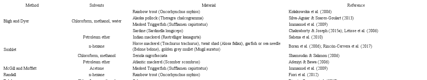 Several methods vary according to the type of solvent or treatment used on the sample. The most common are the ones of Soxhlet and Bligh-Dyer, however, others such as McGill-Moffatt and the one of Randall and Folch have also been evaluated (Fiori et al., 2012; Immanuel et al., 2009; Rincón-Cervera, Villarreal-Rubio, Valenzuela, & Valenzuela, 2017).