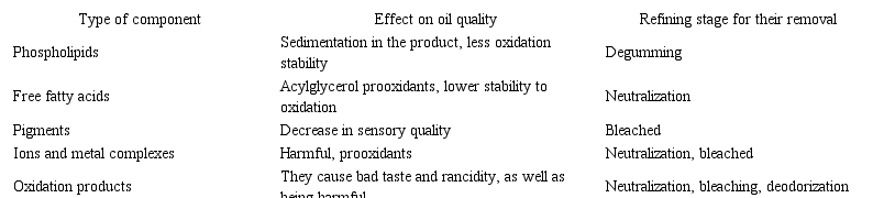 Several studies have been carried out to evaluate the effect of the refining process on different oil properties, through the establishment of parameters such as acidity, peroxides, thiobarbituric acid, iodine, saponification and anisidine indexes, which are some of the most important ones.
