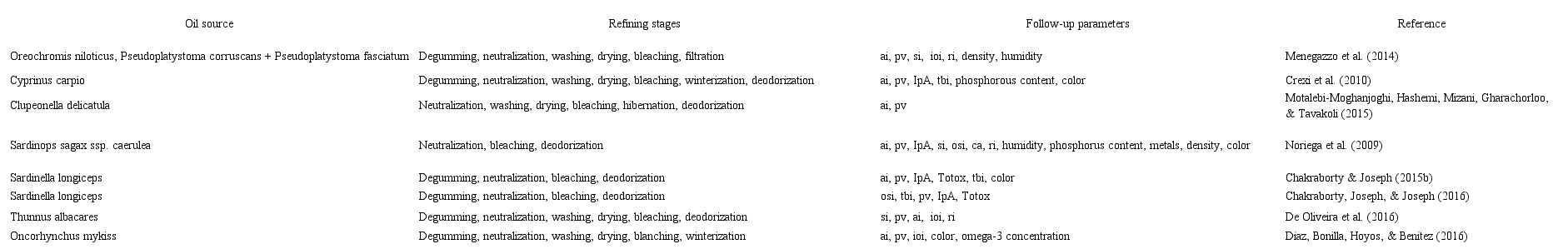 Impurities in the oil reduces its quality (Huang & Sathivel, 2010) and must be eliminated while maintaining the most desirable compounds, such as omega-3 and other PUFA, so the refining process must be designed in such a way that this goal is achieved, minimizing oil loss and maximizing the availability of beneficial constituents (Vaisali et al., 2015).