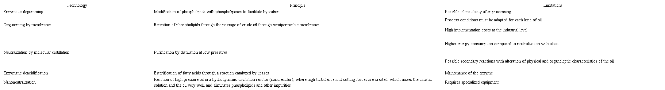 Some authors have carried out a review of different discovered and rediscovered technologies (as in the case of enzymatic processes) for the optimization of the refining process of edible oils (table 7) (Čmolik, & Pokorný, 2000; Kumar & Krishna, 2015; Misra, Nandi, & Nandi, 2013; Moharana, Byreddy, Puri, Barrow, & Rao, 2016; Vaisali et al., 2015).