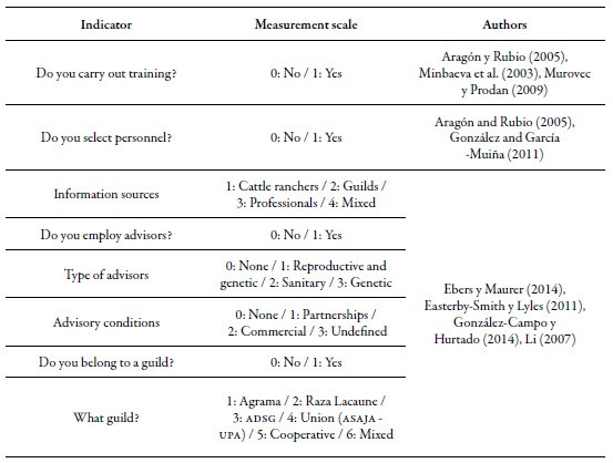 Authors such as Li (2007), Easterby-Smith and Lyles (2011), Ebers and Maurer (2014) and González-Campo and Hurtado (2014) emphasize that access to external information sources is directly related to the absorption capability, as it allows organizations to gain access to valuable external knowledge. Therefore, access to external information sources (e.g., livestock farmers, guilds, professionals) and the use of advisors on essential aspects of their activity, the conditions of such advisory services and the frequency of these, are indicators of absorption capability in livestock farms. Table 2 shows the indicators of absorption capability proposed and the authors that support these.