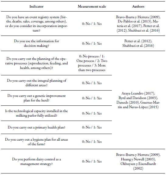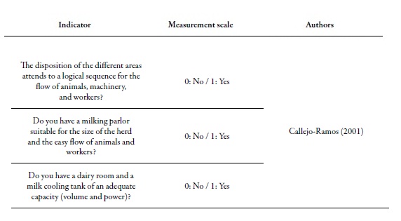 Callejo-Ramos (2001) indicates that adequate milking installations influence the maximization of milking performance and, therefore, the reduction in costs. To the extent that the provision of the milking parlor and, by extension, of the different areas of the farm facilitates animal flow and the more effective implementation of activities —and takes into account the appropriate dimension of the milking rooms as well as the dairy and refrigeration tank rooms— the costs incurred will be lower compared to those farms that have not considered this. Table 4 shows the indicators of innovation capability proposed and the authors that support these.