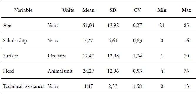 Specialized literature reports a positive relationship between the adoption of innovations and the size of the production units (Fernández-Cornejo, 1996; McNamara et al., 1991). In the study region, 91 % of small- and medium-sized producers have average herds that include between 21 and 55 animal units, 18 to 29 breeding cows and 32 to 44 ha of agricultural land, in average (Cuevas, Loaiza, Espinosa, Vélez, & Montoya, 2016).