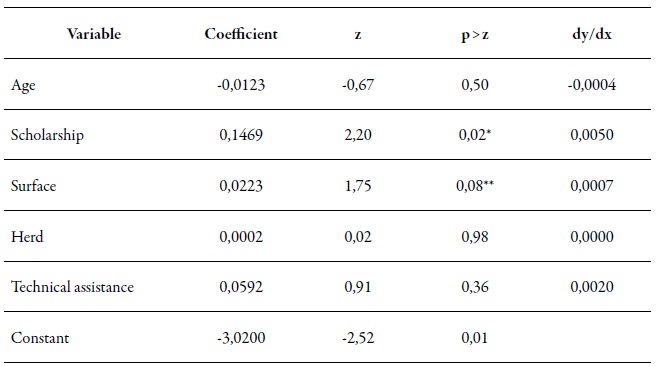 The Wald test (z-statistic) applied to the coefficients of the model evaluated shows that two variables were significant in explaining the adoption of silage practice among farmers in the study region. The first is the level of schooling, measured by the years of study undergone by the producer (p < 0.05), and the second is the agricultural area, measured in relation to the total area in hectares of the productive unit (p < 0.10). The results of the probit model are presented in table 2.