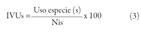 Donde Uso especie (s) es el número de citaciones para cada especie y Nis, el número de informantes encuestados.