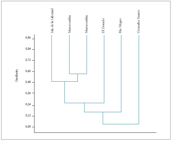 El análisis de conglomerados empleado en las localidades del área de estudio da como resultado la formación de dos agrupaciones por encima del 12,90 %. Donde el primer grupo está formado por las localidades: Isla de la Libertad, Murocomba, El Dorado, Río Negro y el Mirador de Valencia, a diferencia de Gonzáles Suárez que se haya distante, formando otro grupo (figura 3).